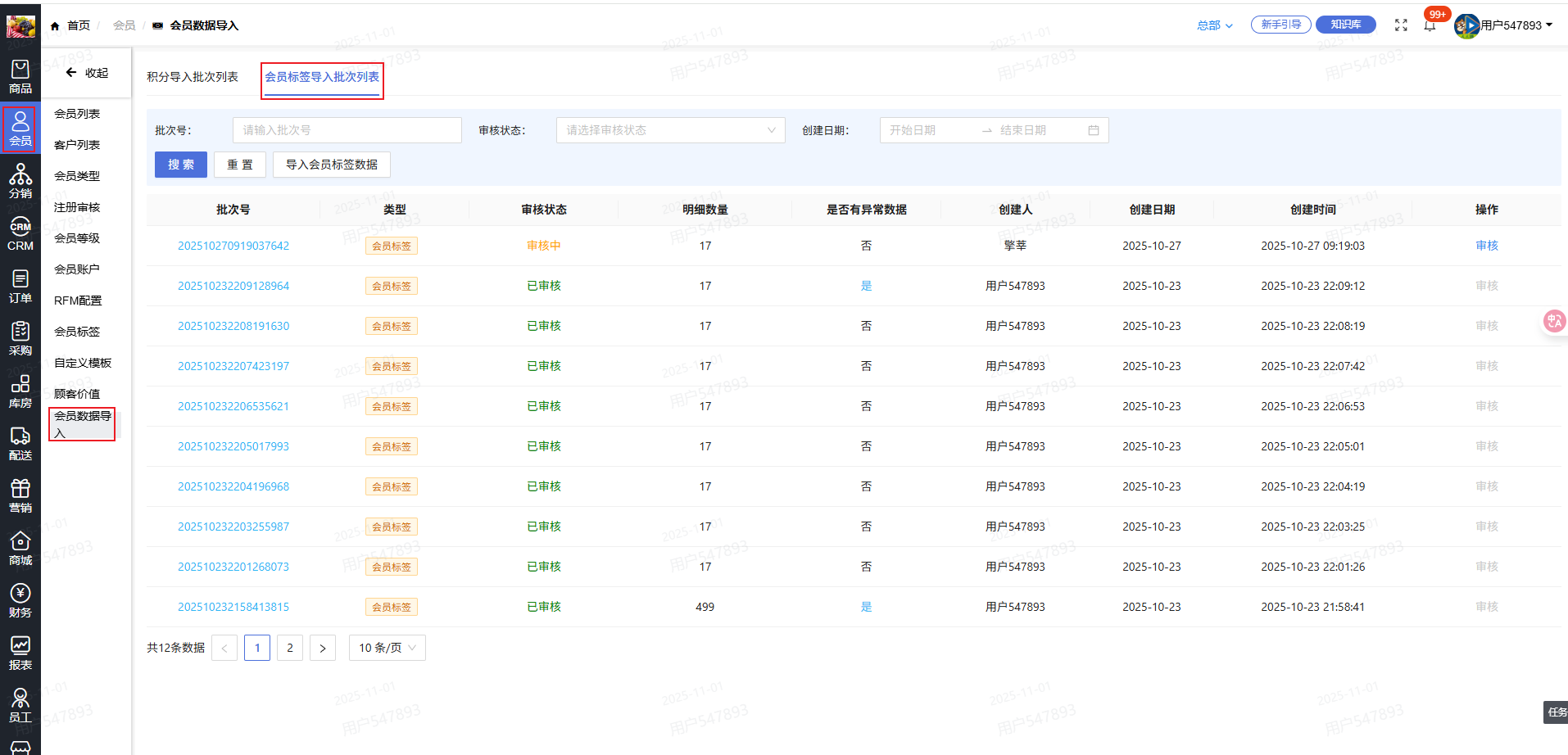 - 优化项5.新增批量导入会员标签功能,在会员数据同步模块新增标签导入批次列表,操作与积分导入一致。