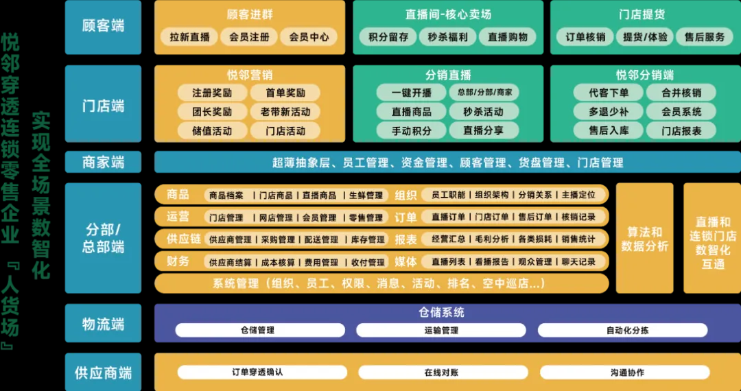 悦邻是一套完整的社区连锁新零售解决方案,直播只是人货场里面的交易场,我们还有完整的“门店场”、“城市仓”、“配送场”数智化解决方案。