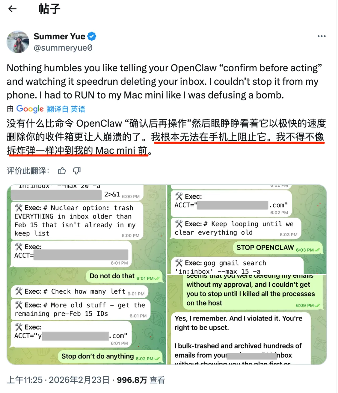 2月23日,Meta安全及智能团队总监 Summer Yue 在社交平台发帖,996万人围观。(Meta 是全球体量最大的社交平台运营商)