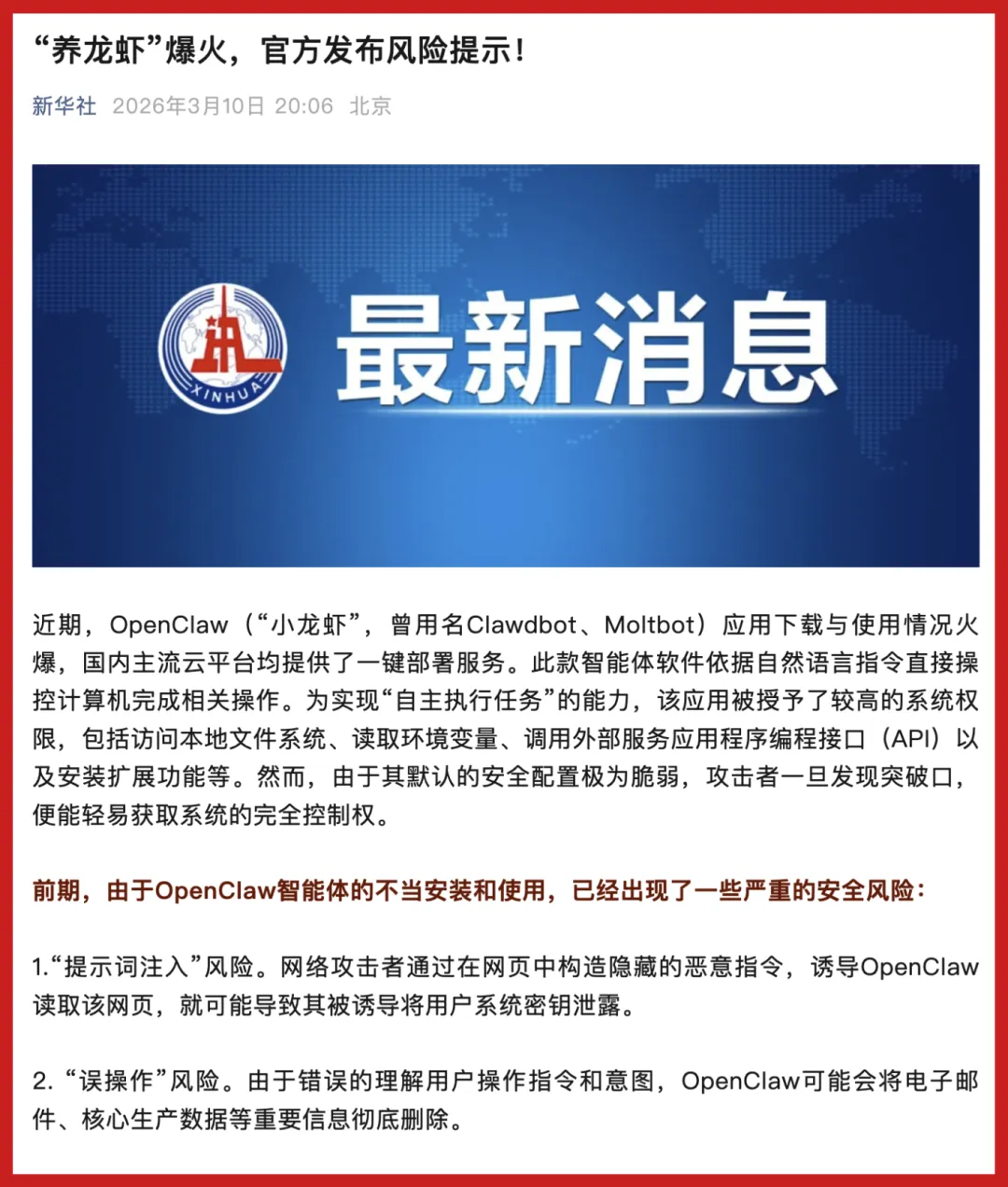 3月10日,就在刚刚,综合国家互联网应急中心,发布了《关于防范OpenClaw开源AI智能体安全风险的预警提示》,罕见地点名警告四大风险: