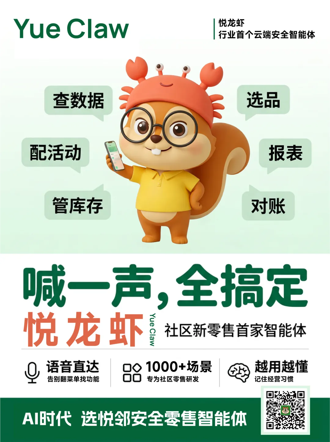 YueClaw 悦龙虾,专为社区新零售赛道研发的首个云端安全智能体,即将到来。
