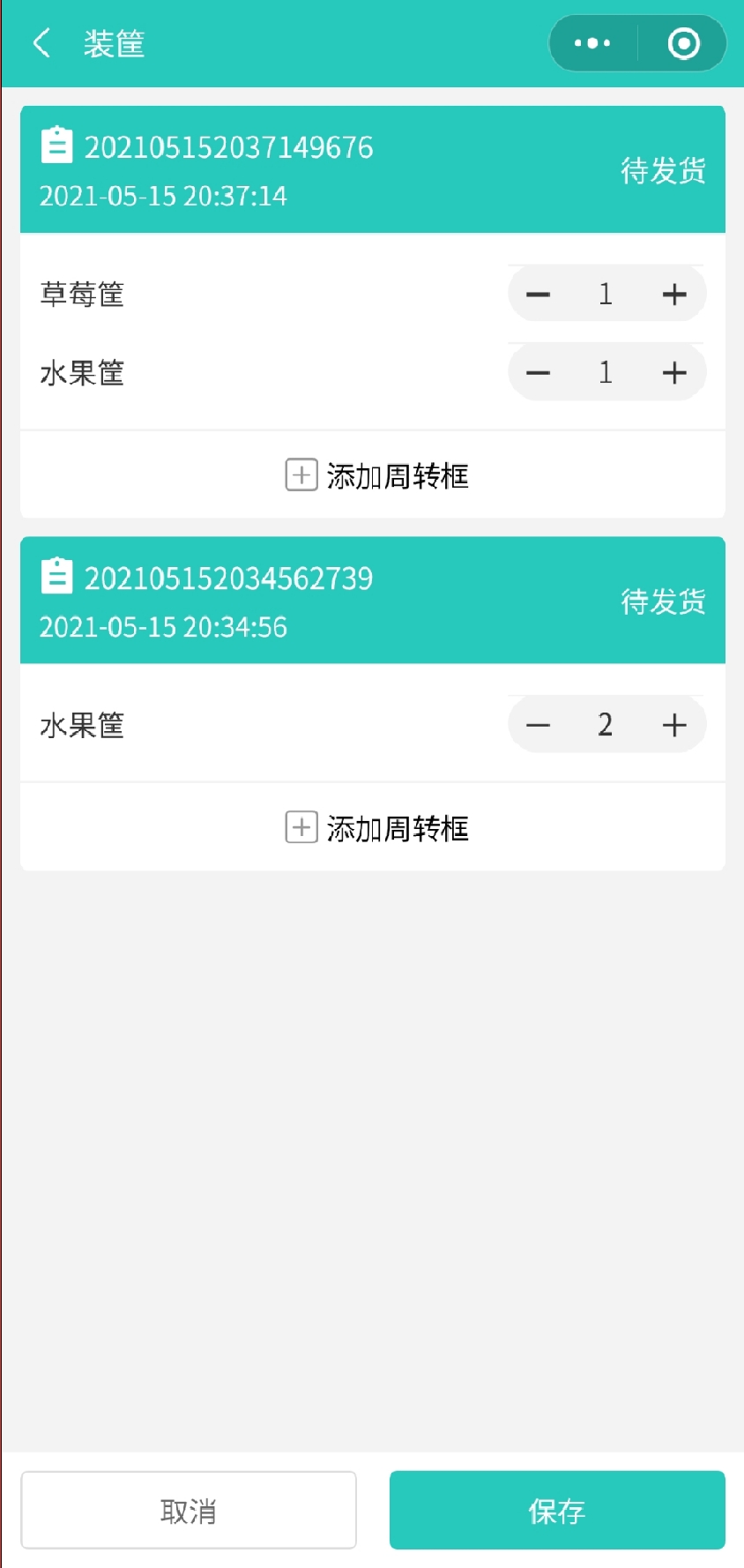 装筐:司机发货之前可在装车菜单中选择要装筐的客户订单进行装筐,发货后周转筐自动借出,在押金筐页面中可以查看借出的周转筐及押金筐列表。