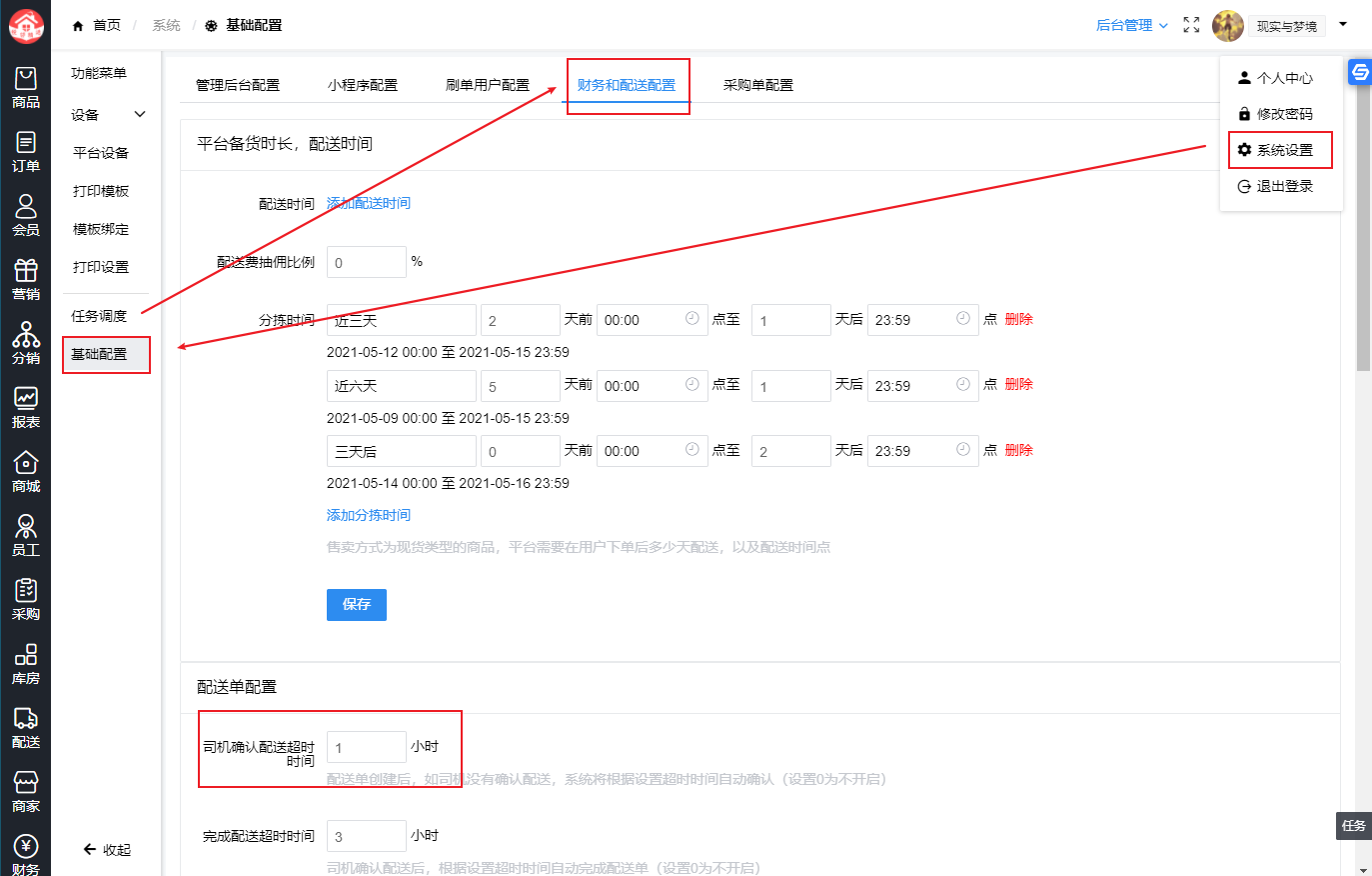超时自动确认配送:系统管理后台的配送单配置中,填入司机确认配送超时时间,如1小时,则生成配送单一小时后若司机未确认配送,配送单会自动确认,状态变为配送中。