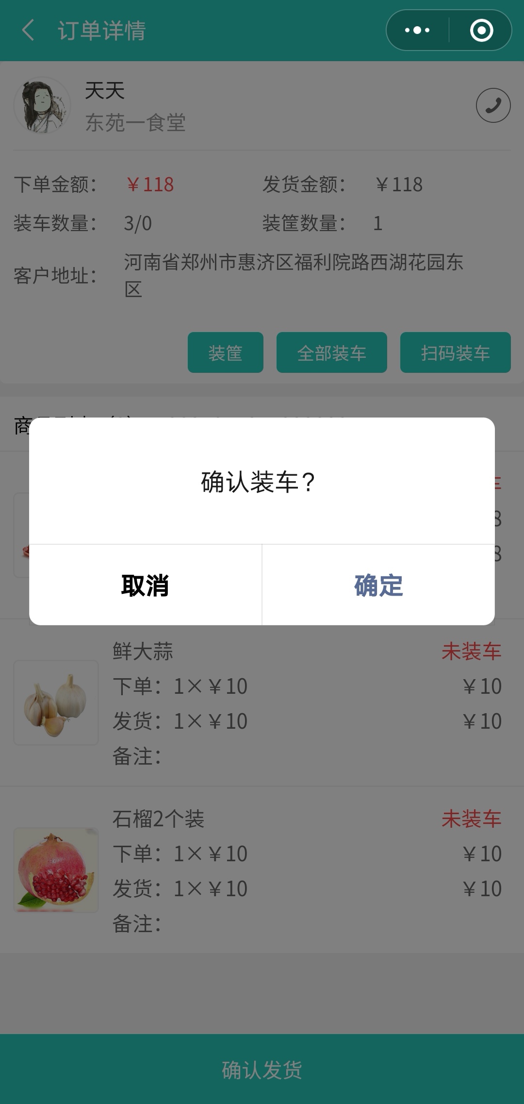 一键装车:点击全部装车按钮,确认后商品全部为已装车状态。